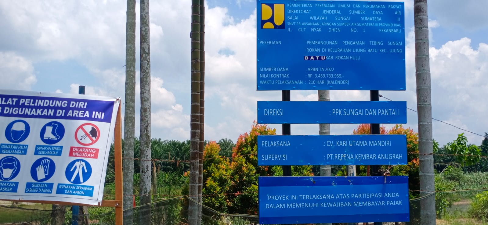 Proyek kementrian PUPR direktorat jenderal sumber daya air balai wilayah sungai sumatera (BWSS) III masih dalam pengerjaan, pembangunan yang bersumber dari APBN th 2022 nilai kontrak Rp 3.459.733.959 dikerjakan CV. Kari Utama mandiri.